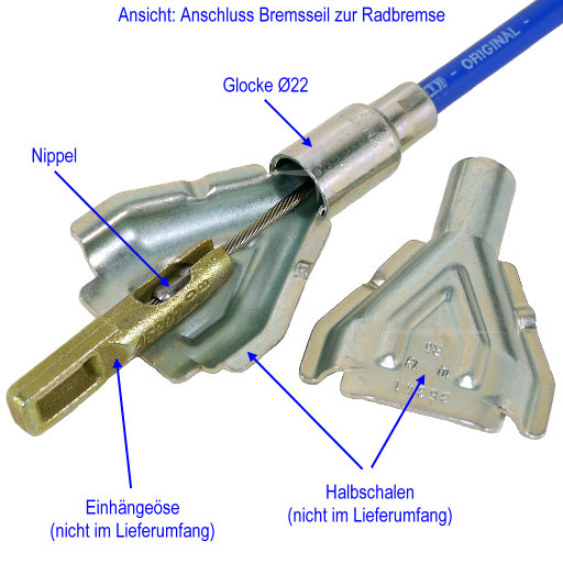- einerseits Hülle mit Glocke Ø22 mm (innen Ø18,5 mm) + Seele mit Nippel