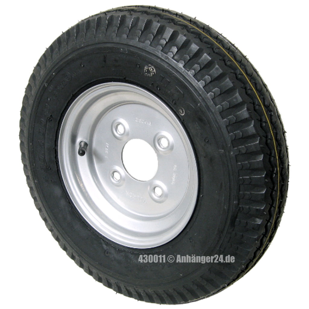 Komplettes Anhängerrad mit Reifen 4.00-8 (4.80-8) 70N montiert auf 4-Loch-Stahlfelge 2.50x8, 4-Loch Radanschluss, bis max. 140 km/h und 275 kg/Rad (550 kg/Achse)