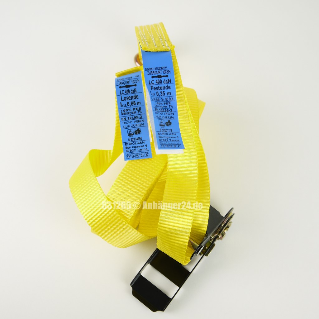 Nach DIN EN 12195-2 zertifizierter 2-teiliger Zurrgurt mit kräftiger Spannratsche und Spitzhaken an den Gurtenden. Die Zurrkraft LC (Lashing Capacity) ist die Kraft, die im geraden Zug maximal in einen Zurrgurt eingeleitet werden darf. Die Werte sind in daN und für den geraden Zug angegeben. Bei Umreifungen bzw. Niederzurren kann der angegebene Wert verdoppelt werden.