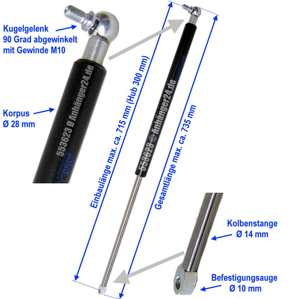 Gasfeder / Hebehilfe für diverse Westfalia Pferdeanhänger Heckklappe, Länge 415 - 715 mm, 2300 N, oben Winkelgelenk M10 / unten Auge Ø 10 mm