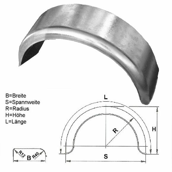 1-Achs-Kotflügel aus verzinktem Blech, Innenwand gerade, Außenwand mit Wulst, Anbringung an der Bordwand, Profil R12/40