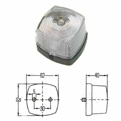 Positionsleuchte für vorderen Anbau. Lichtscheibe glasklar. Grundplatte aus schwarzem Kunststoff. 2 Löcher für Befestigungsschrauben M5. |