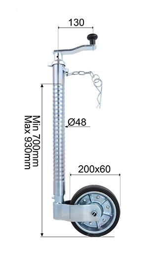 Verstärktes Stützrad Ø48 mit extra langem und geriffeltem Außenrohr gegen Durchrutschen, mit Kurbel-Sicherung.